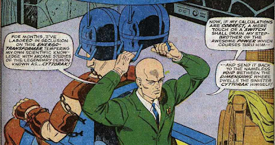 Meanwhile, Prof EX [FORESHADOWINGnoSPOILERS!] thinks it's a good idea to hook his brain up to Juggernaut's using an elaborate system of vintage hair-driers. [I know it's silly to call them vintage hair driers, because back then they were state-of-the-art.] The hope, here, is that Xavier can use his superior brain-age to drive the demon Cyttorak from his half brother's brain, freeing him from being Juggernaut. Instead, something else fights back and the machine explodes. The result is 3-part: 1) it frees the Juggernaut and 2) knocks out Xavier AND 3) gives Juggernaut mental powers of telepathy. Great. If there was a "worst case scenario" here, this is it. (Unless it also spontaneously generated a storm of sharks. Smart sharks. Ones that knew math and when to stop wearing white slacks. Chilling scenario.